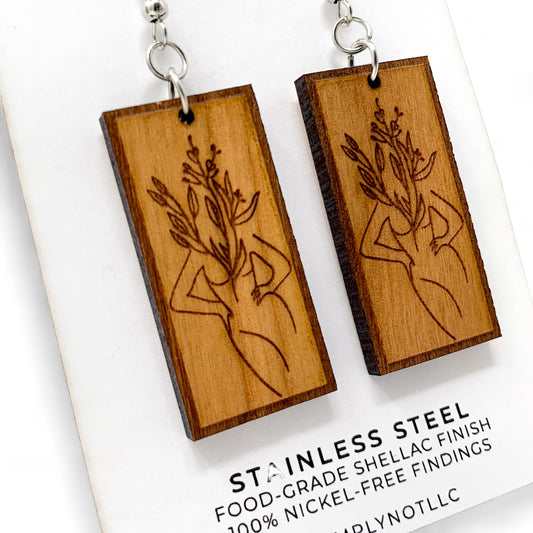 Goddess Body on Cherry Wood Dangle Earrings - Front