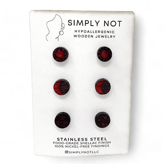 Celestial Earrings - Sun, Moon & Stars Stud Earrings in Purpleheart Wood